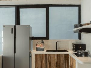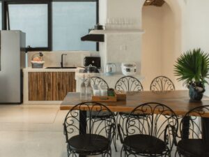 - Nhà bếp: Bếp điện, lò vi sóng, tủ lạnh, bàn ăn & ghế cao, đầy đủ dụng cụ nấu nướng.